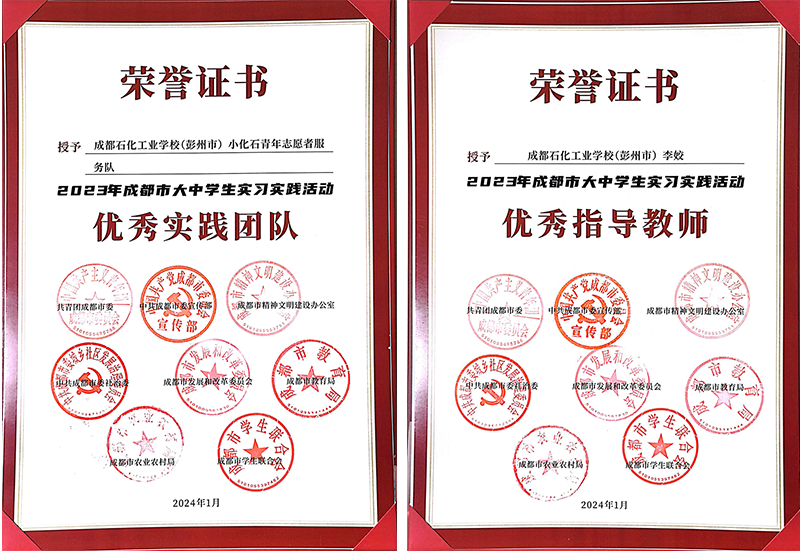 共青团成都市委、中共成都市委宣传部等八大部门颁发了2023年成都市大中学生实习实践活动荣誉证书。我校“小化石”青年志愿者服务队荣获优秀实践团队,李姣老师荣获优秀指导教师。