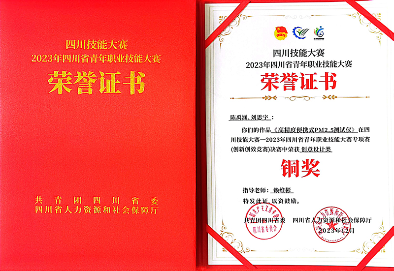 近日,共青团四川省委、四川省人力资源和社会保障厅颁发了2023年四川省青年职业技能大赛荣誉证书。我校陈禹涵、刘思宇同学在赖维彬老师的指导下荣获创意设计类铜奖。