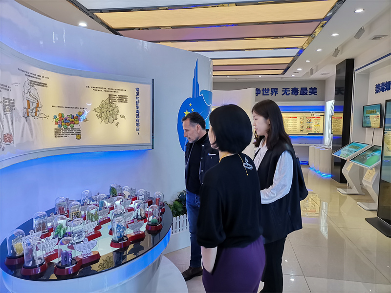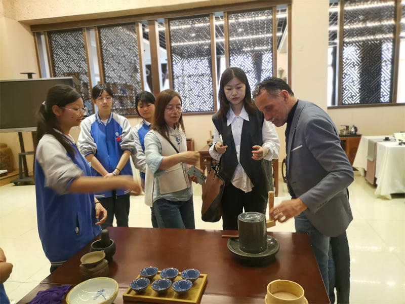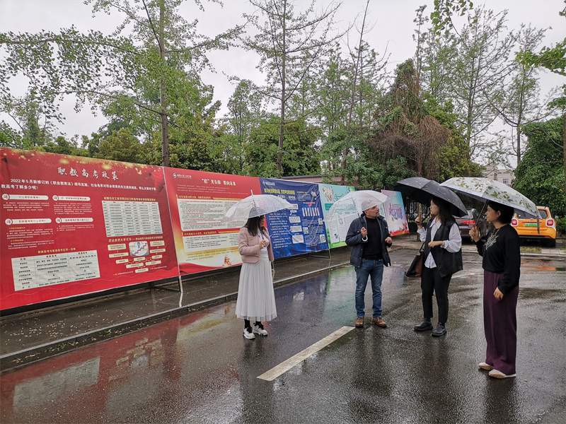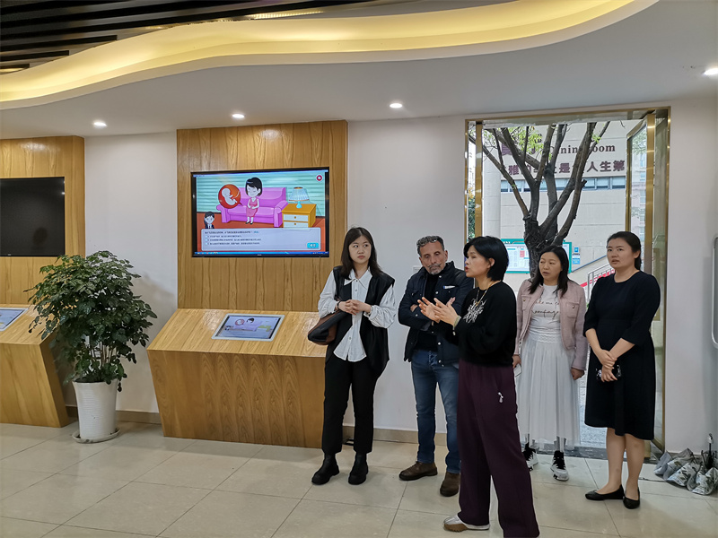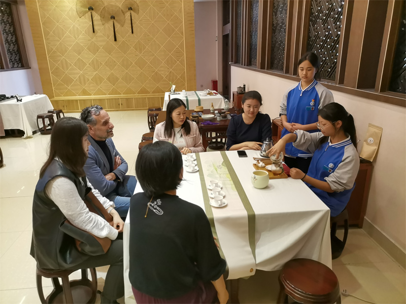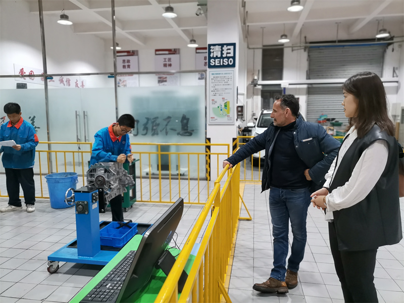Hubert Joby先生一行沿着行知长廊漫步成都石化工业学校校园,参观了高星级饭店运营与管理实训中心和汽修实训中心,感受了中国茶文化的独特魅力,并在罗冬梅带领下参观学校的法制教育基地和禁毒教育基地,对彭州的职业教育特色有了基本的认识。
