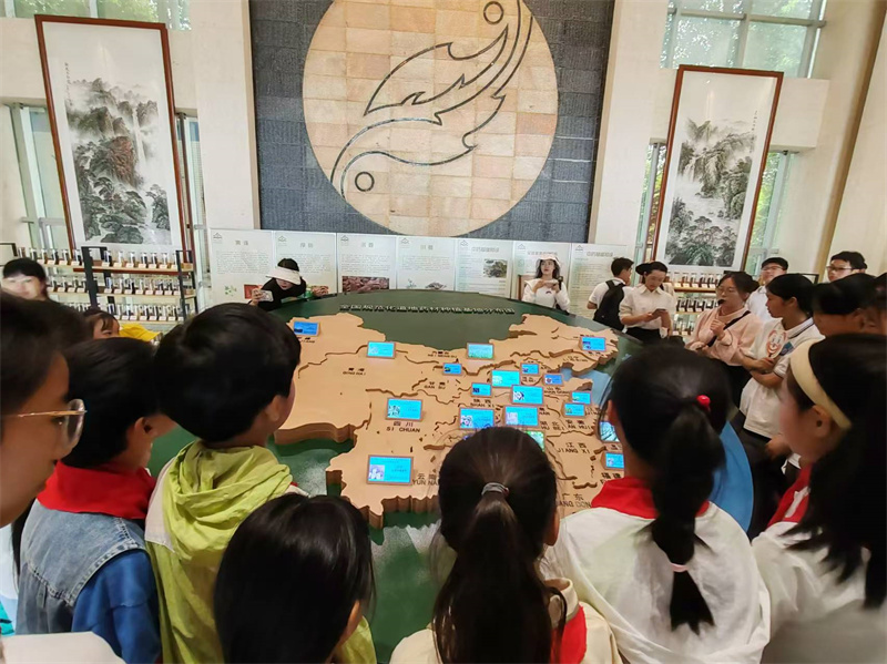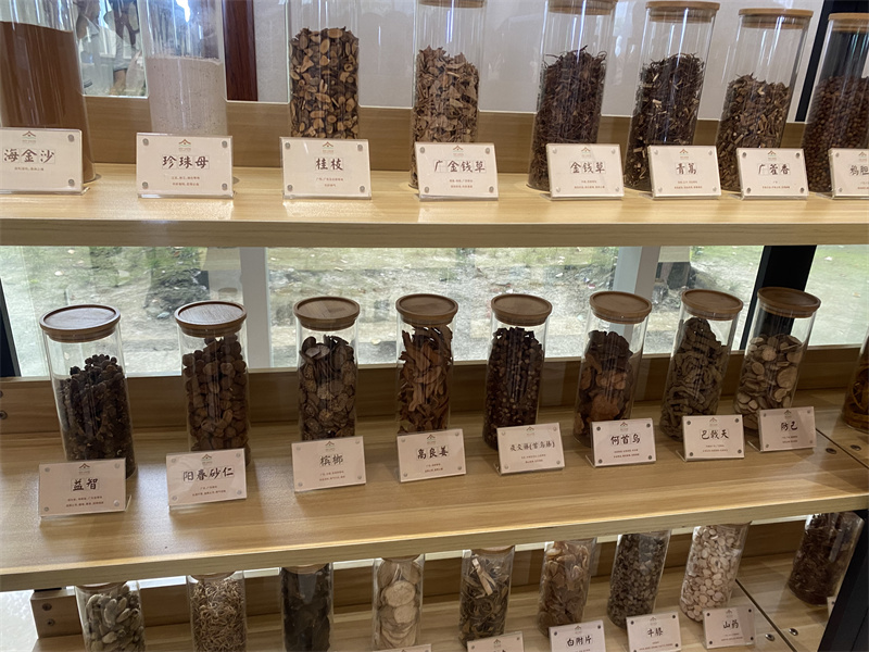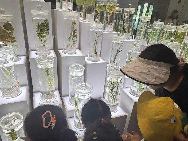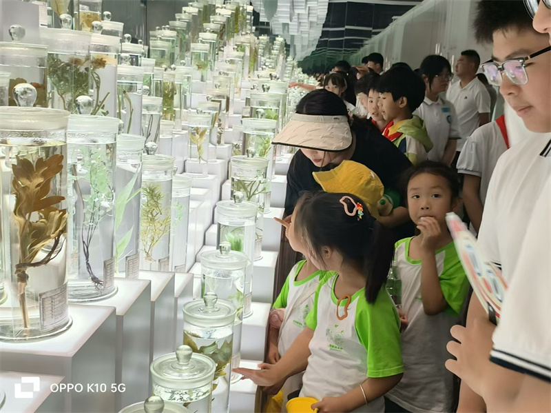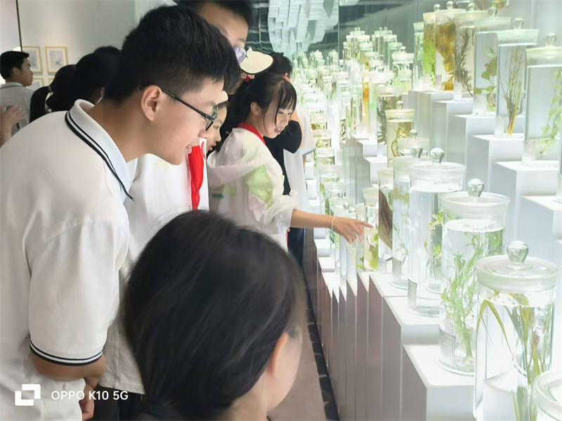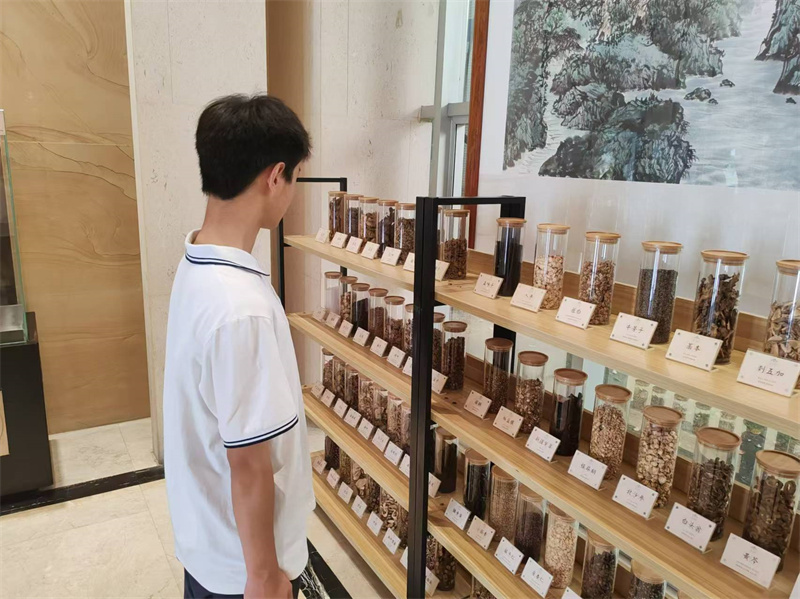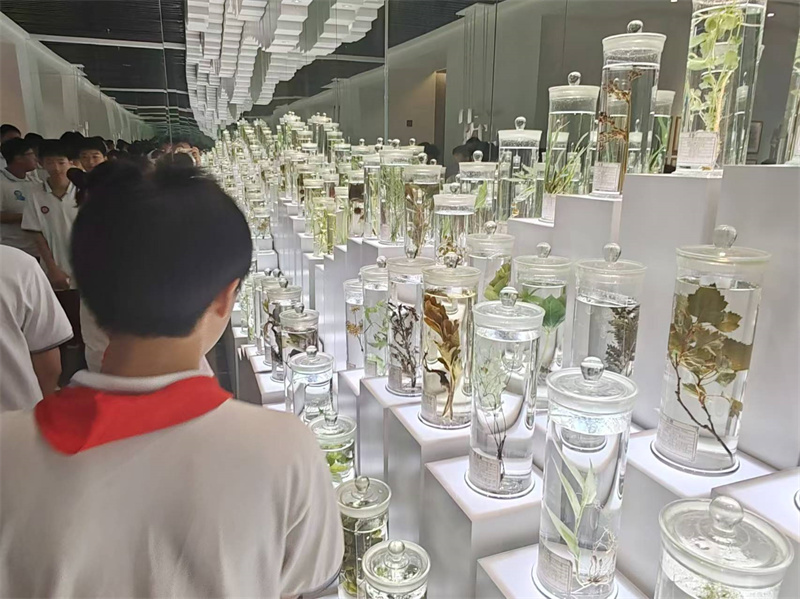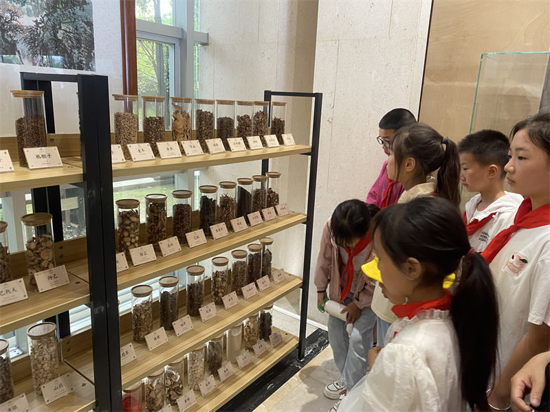 在湔山堂中医药文化研学基地“中药材浸泡标本展示区”,看着那满墙的中药材标本,同学们第一次直观感受中草药的形态美。这里陈列着180多味中药材的标本,每一个标本的展示装置上都标有药材的名字、科属、分布、习性等。