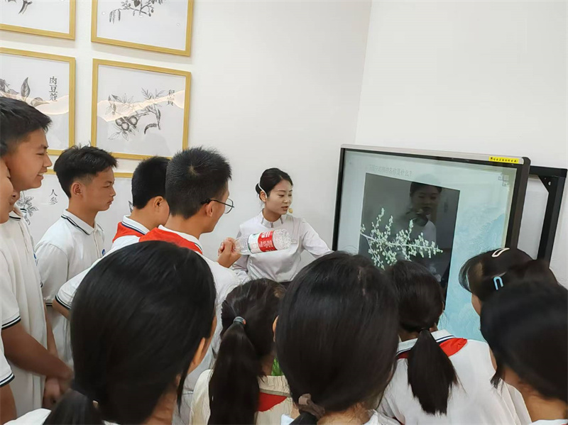讲解员介绍了被称为“东方药物巨典”“中国古代百科全书”的药学巨著《本草纲目》。大家共同聆听了中国第一位荣获诺贝尔奖的屠呦呦奶奶的故事,切实感受到了中医药深厚的文化之美。