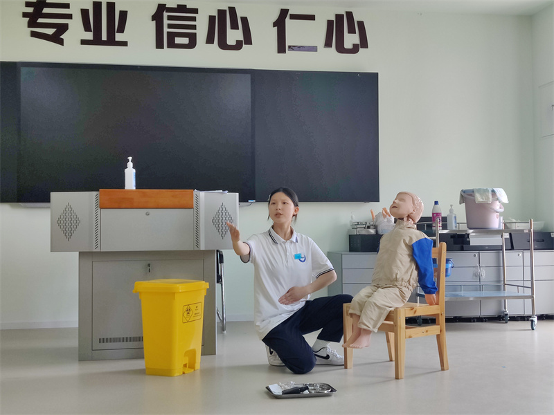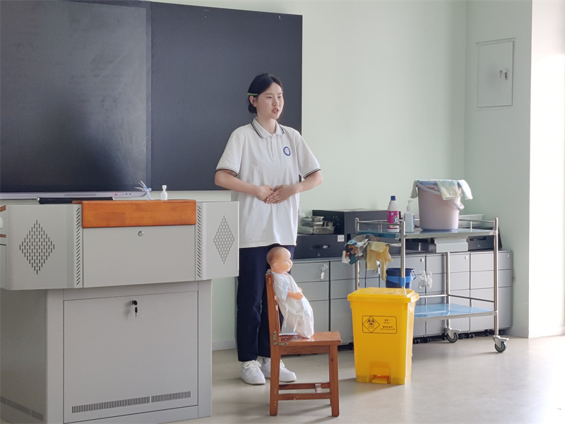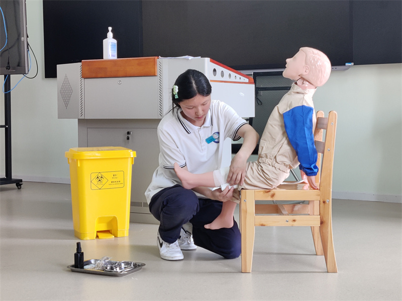 成都石化工业学校幼儿保育专业学生分别展示了婴儿沐浴、卧具整理、烫伤的应急处置、外伤出血的应急处置、高热惊厥应急处置等婴幼儿照护技能实操、故事讲述和韵律活动组织等婴幼儿早期学习支持技能。此后,四位企业专家分别对学生的操作进行了专业的评价和指导。