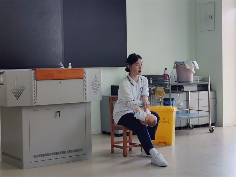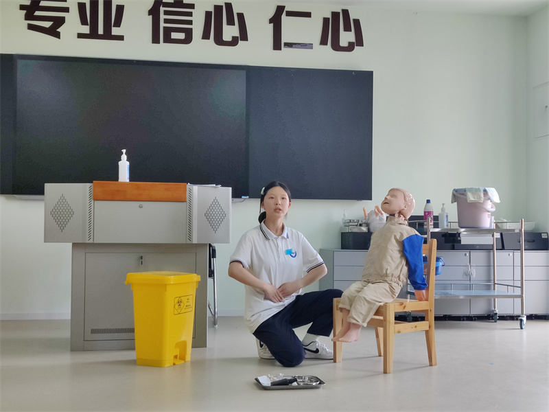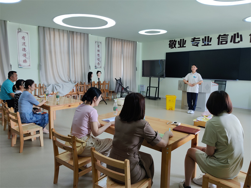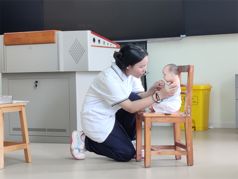 5月20日,成都石化工业学校育儿保育专业邀请彭州市隆丰幼儿园工会主席、军乐园区业务园长吴雪,彭州市妇幼保健院护士长姚翠、罗医生和妇幼保健院托育园罗老师对学生幼儿照护技能进行指导。