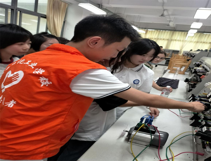 解说组志愿者对各专业展区做详细介绍,热情邀请参观学生体验各展示项目,参与社团互动。