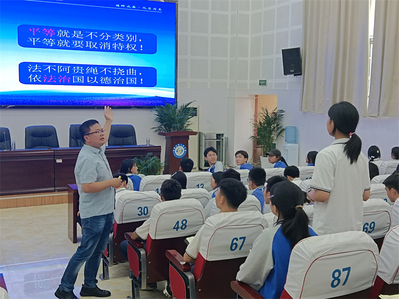 接着,李正以名人名言、政策法规引入课题,通过生活中与同学们息息相关的事例解释自由是指人的意志自由、存在和发展的自由,是人类社会的美好向往,也是马克思主义追求的社会价值目标。阐述平等指的是公民在法律面前的一律平等,其价值取向是不断实现实质平等,要求尊重和保障人权,人人依法享有平等参与、平等发展的权利。强调公正即社会公平和正义,它以人的解放、人的自由平等权利的获得为前提,是国家、社会应然的根本价值理念。讲解法治是治国理政的基本方式,依法治国是社会主义民主政治的基本要求,通过法制建设来维护和保障公民的根本利益,是实现自由平等、公平正义的制度保证。