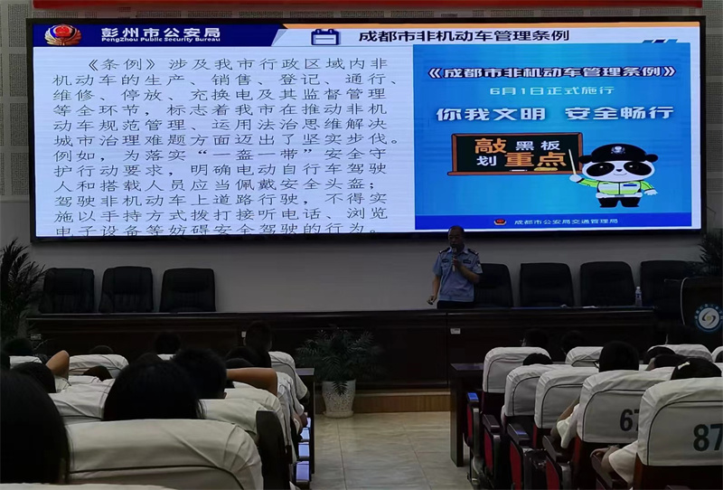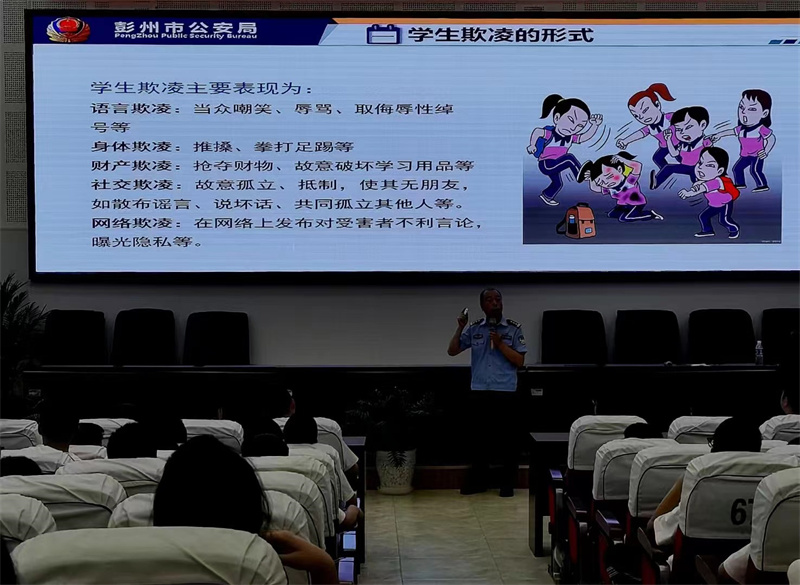 彭州市公安局治安大队副大队长王东围绕“防学生欺凌”“防交通事故”“防溺水”“防电信诈骗”“生命安全”等主题展开了一次内容丰富的安全教育。