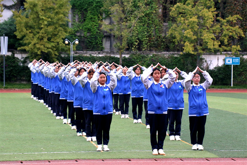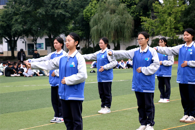 在近三个小时的比赛过程中,各班同学呈现了诸多精彩瞬间?!?234 12 34”随着响亮的口号,参赛班级的同学们步调统一、精神饱满地跑到比赛区;手语操展示环节,每一个手势都标准到位、整齐划一,仿佛在述说对祖国的无限热爱。