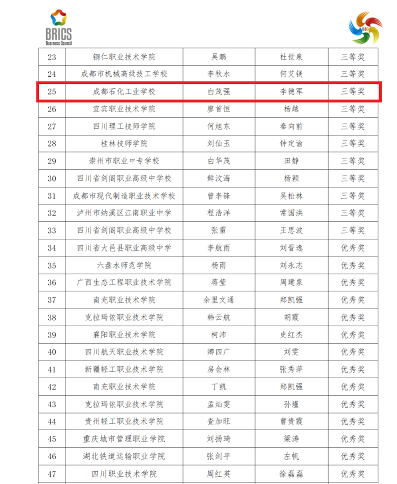 ——成都石化工业学校机械专业学生在2024年金砖国家职业技能大赛中国(西部赛区)机械设计CAD赛项中获奖