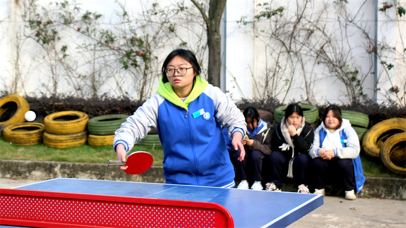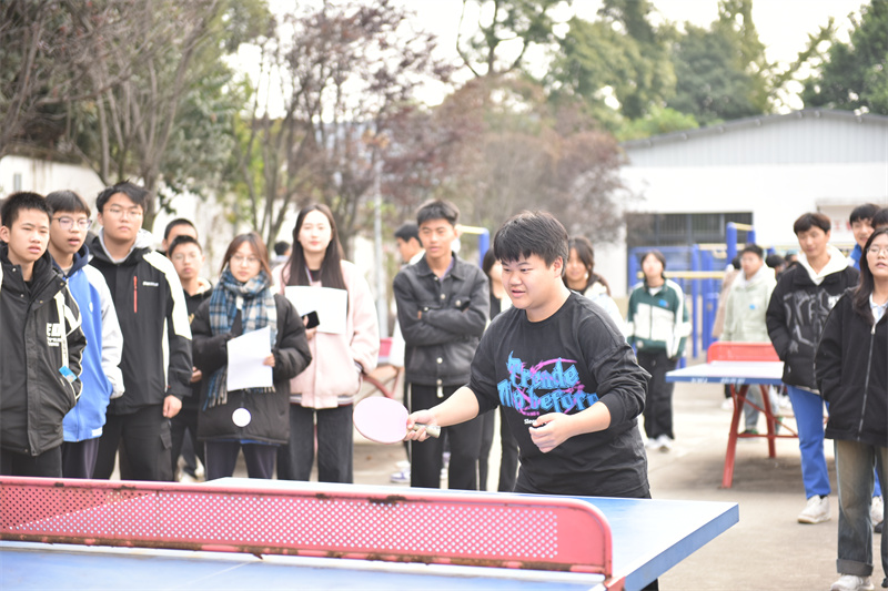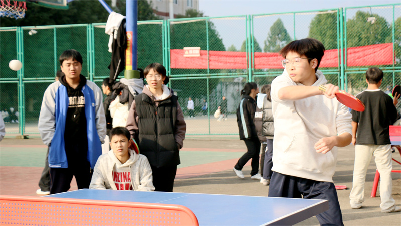 乒乓球赛场上,十张乒乓球桌同时进行男单、女单比赛,集中体现了学生全面的综合素质和勇于拼搏的精神风貌。