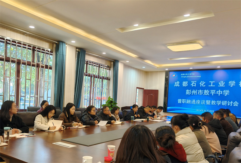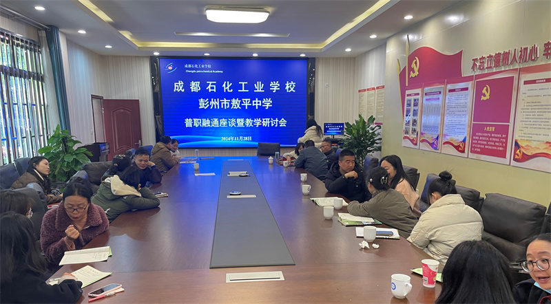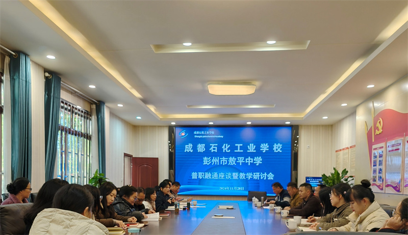 11 月 28 日上午,成都石化工业学校在北校区第三会议室与彭州市敖平中举行了普职融通座谈暨教学研讨会。彭州市敖平中学副校长王勇携各学科备课组长及骨干教师出席,成都石化工业学校副校长罗冬梅、教务处行政、文化基础学科教研组长和普职融通班科任教师参加了此次研讨会。