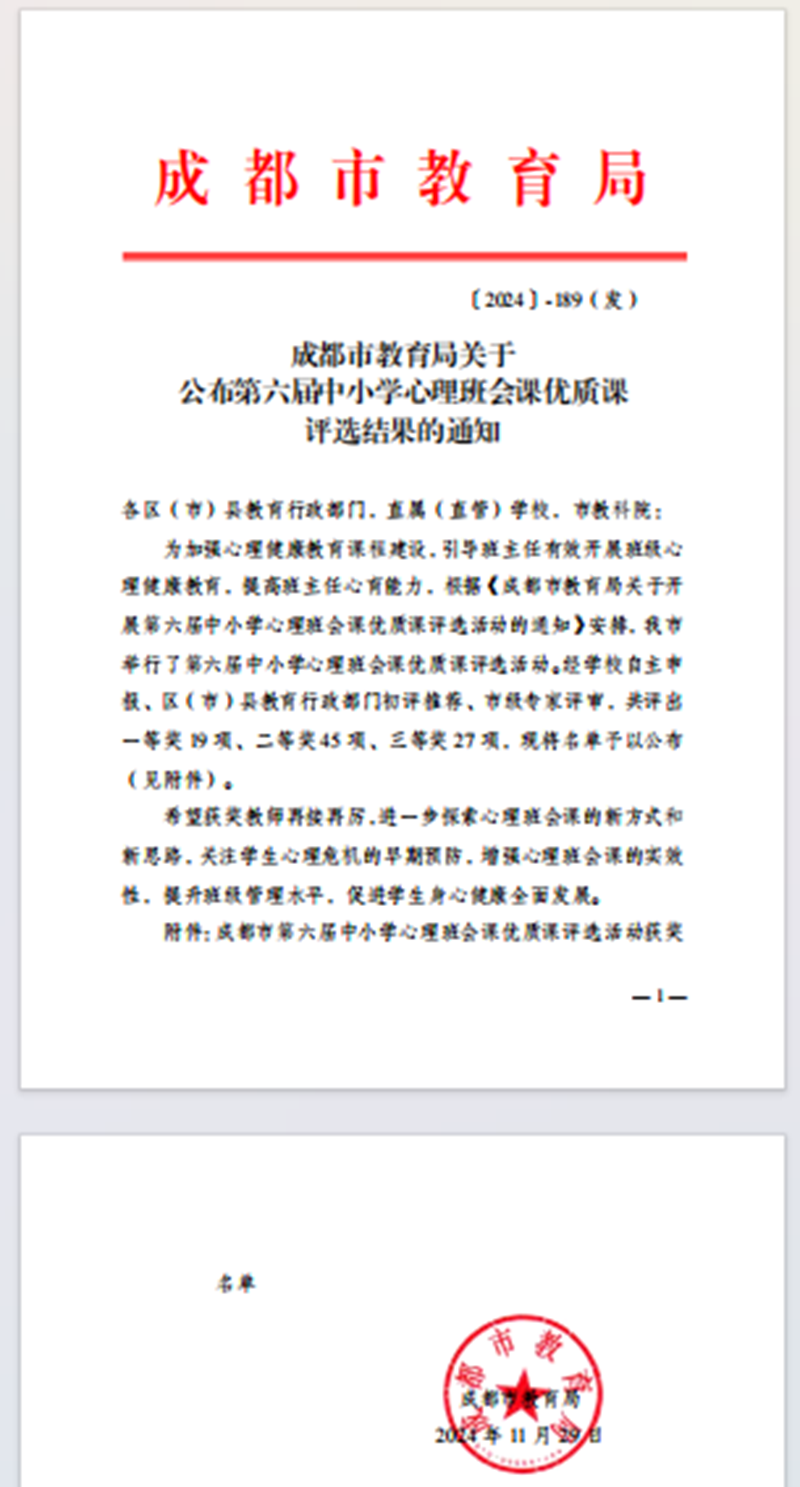 在成都市心理健康优质课评选活动中,我校邹媛媛老师凭借出色的教学设计、精湛的教学技艺与独特的课堂魅力,脱颖而出,荣获成都市中学组一等奖!这不仅是老师个人专业素养与教学能力的高度体现,更是学校教育教学成果的有力彰显。