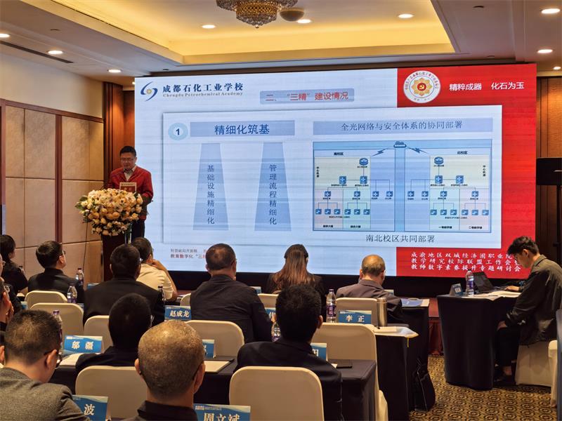 成都石化工业学校党委专职副书记、纪委书记李正在以《转型破局开新路 数字赋能促发展》为主题的发言中,分别从“精细化筑基”(实现全光网络与安全体系的协同部署)、“精准化整合”(以“决策科学化”“服务场景化”实现数据中台驱动的资源重构)、“精致化创新”(以“教学革新”“德育赋能”“师资升级”实现了数字技术与教育生态的深度融合)等三个方面分享了学校推动教学改革、利用数字技术创新教学模式、提高教师数字素养的实践经验和阶段成果。