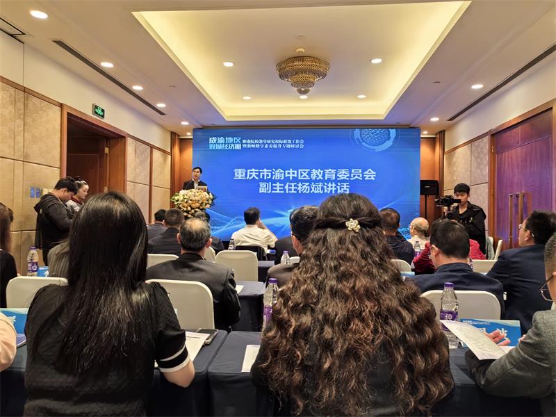 重庆市渝中区委教育工委委员、区教委副主任杨斌到场祝贺并致辞。来自成渝两地的多所职业院校齐聚一堂,共同探讨职业教育的前沿话题。重庆市渝中职业教育中心、成都市财贸职业高级中学校、重庆市两江职业教育中心、成都石化工业学校、重庆市工信职业学院、四川省邻水县职业中学、重庆市巫溪职业教育中心、四川省资中县职业技术学校、重庆市工艺美术学校、重庆市医药经贸学校等院校的代表先后登台,围绕职业院校教学及教师数字素养提升展开深入研讨,积极探索成渝两地职业教育高质量发展的新途径。