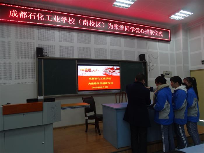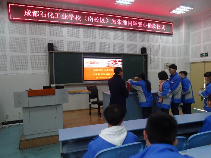用心点燃希望、用爱撒播人间,12月5日在校团委的组织下,成都石化工业学校南校区师生在107会议室为张维同学举行了情暖人间爱心捐赠仪式。????
