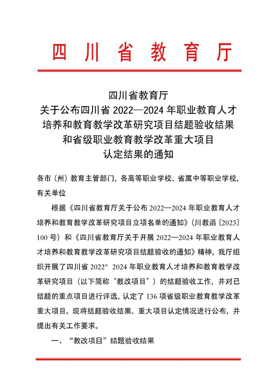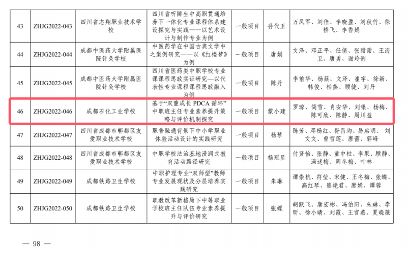 近日,四川省教育厅公布2022-2024年职业教育人才培养和教育教学改革研究项目结题验收结果,由我校副校长蒙小建牵头、8名教师组成的研究团队承担的一般项目《基于“双重成长PDCA循环”的中职班主任专业素养提升策略与评价机制探究》成功通过结题验收。