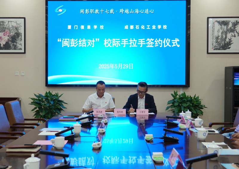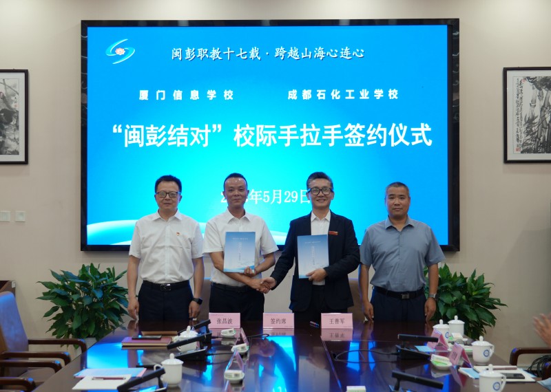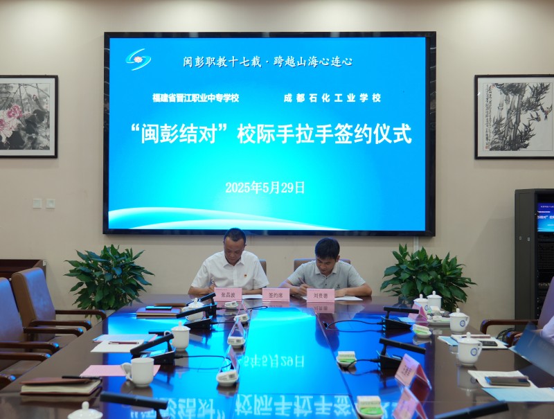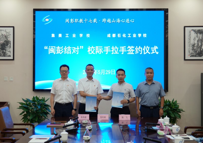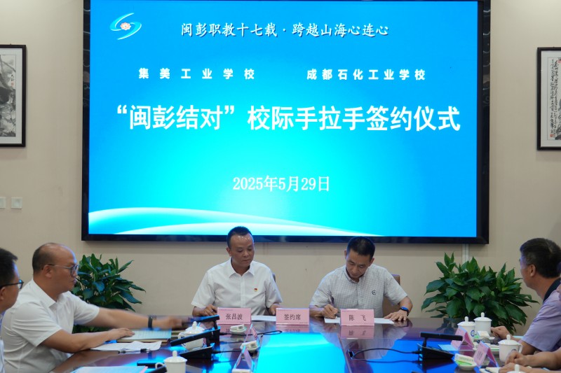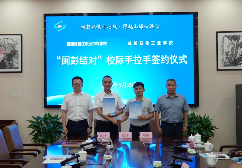 成都石化工业学校党委副书记、校长张昌波详细介绍了学校的基本情况,分享了学校在职业教育改革与发展中的经验和做法。随后,双方举行了“闽彭结对”校际手拉手签约仪式,标志着两地职业教育合作迈入了具有深远意义的新阶段。