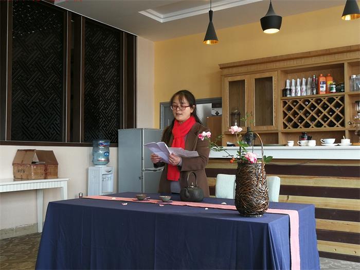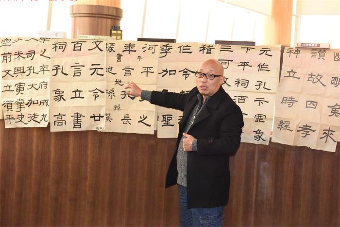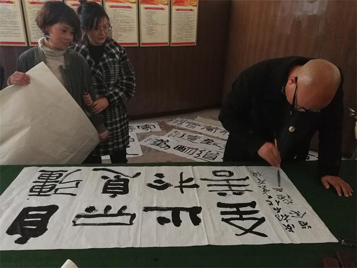 来宾们在旅游实训室品尝了成都石化工业学校旅游专业的学生制作的咖啡,表演的功夫茶。在品尝过程中,成都石化工业学校参加了苏志福工作室的两位老师分别做了专题发言。高华蓉老师为大家介绍了咖啡的相关知识和礼仪,了解咖啡的起源、种类、产地、器具、礼仪等知识。何敏老师结合自己的学习体验作了“书法与诗歌”发言,为大家介绍了书法与诗歌的起源、历史,以及她自己在诗歌创作过程中对书法艺术的感悟。在随后的书法交流过程中,作为中国书法家协会会员的苏志福老师为大家讲解书法的历史和鉴赏方法,并对学员们的作业做了精彩点评,还为在场的老师们示范讲解了隶书的写法,挥毫题写了多幅作品,并为学校题写了“自强不息,止于至善” 的校训。