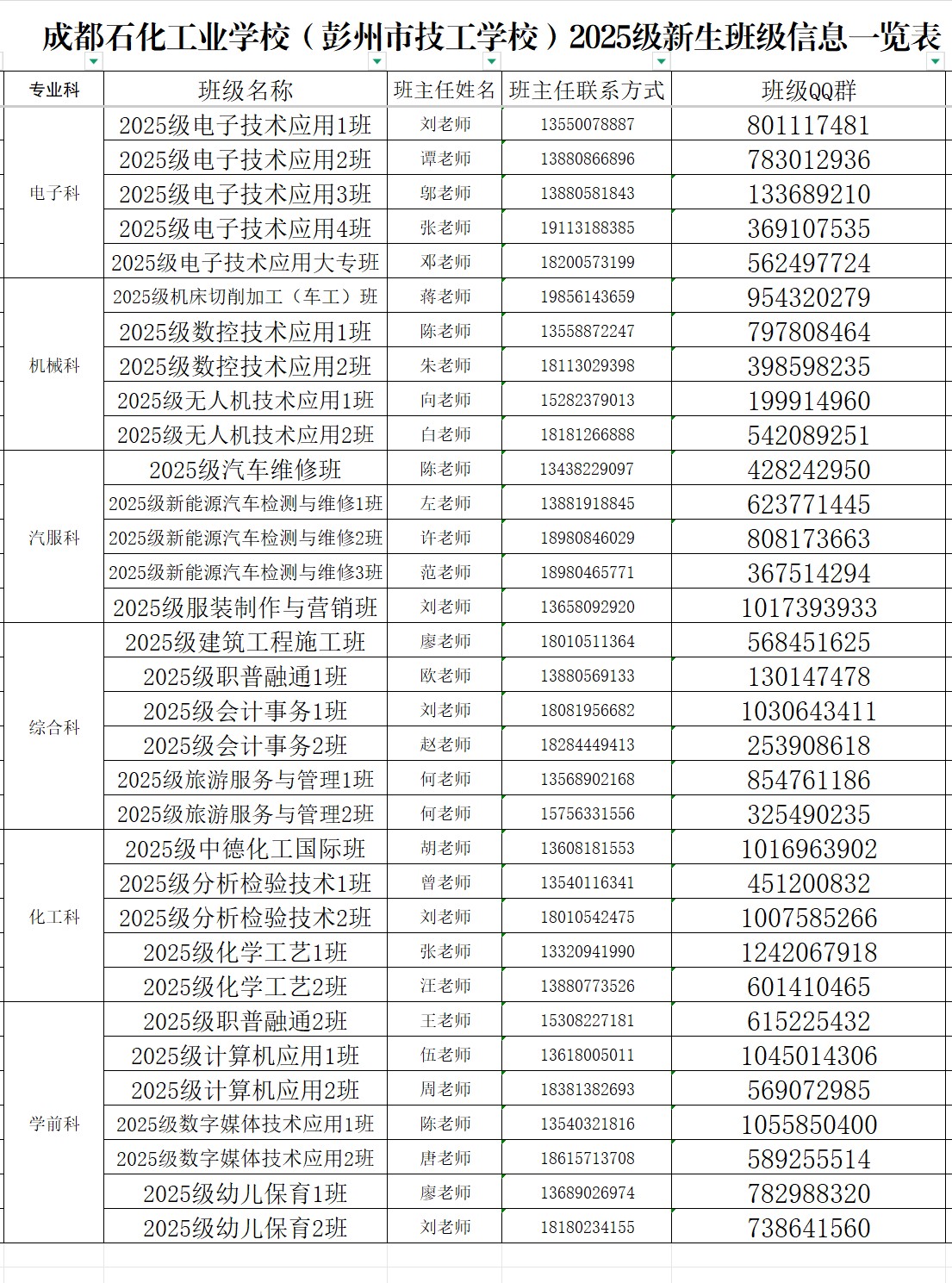 欢迎加入成都石化工业学校(彭州市技工学校)大家庭!现将分班查询及班级QQ群加入事宜通知如下: