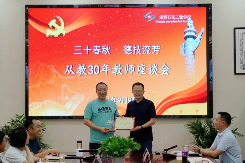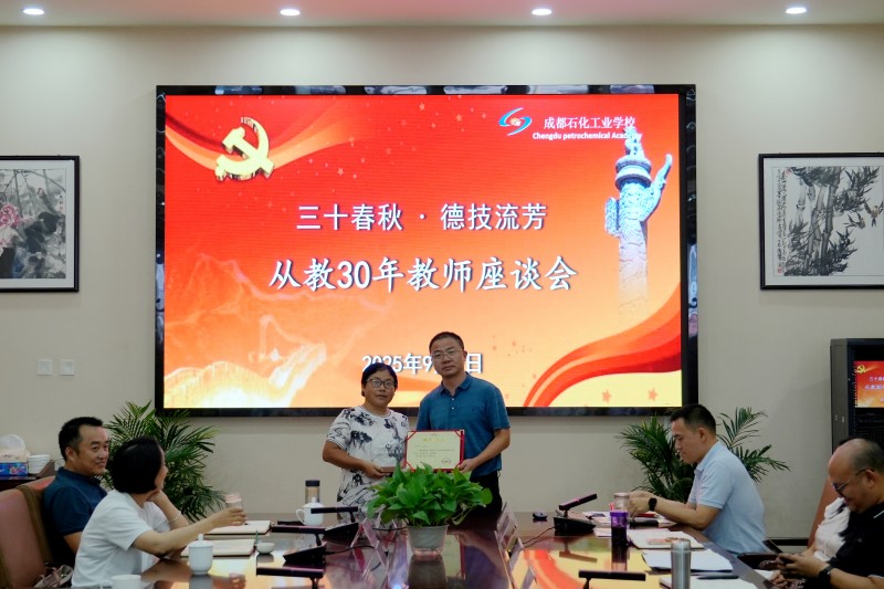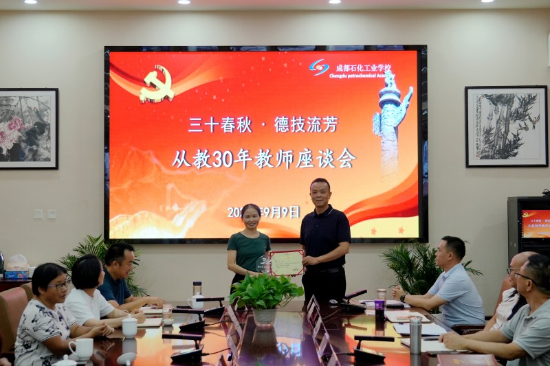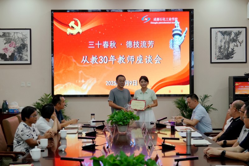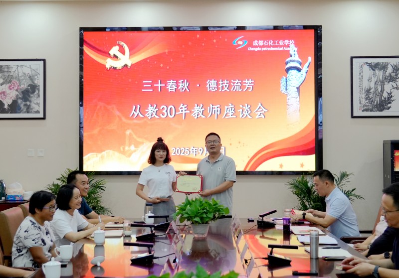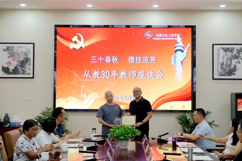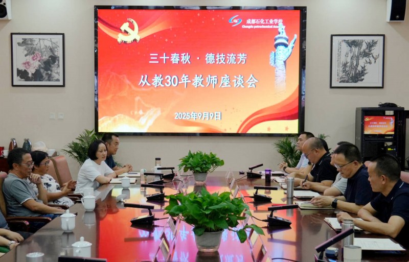 9月9日上午,在第41个教师节来临之际,成都石化工业学校在南校区举行2025年从教30年教师座谈会。学校党委书记周川益,党委副书记、校长张昌波,校级干部出席座谈会,从教年满30年的教职工及新入职教师参加了座谈会。