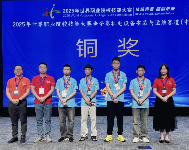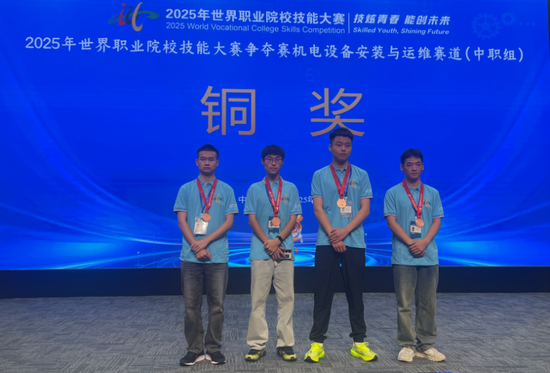 9月18日,在天津举行的2025年世界职业院校技能大赛争夺赛机电设备安装与运维赛道比赛中,由周英建、罗威两位老师精心指导的我校2023级电子技术应用3班刘川豪、2024级电子技术应用大专班车杭潼、2023级电子技术应用大专班赖俊洋和郑烨然等四位选手代表四川省参赛并斩获铜奖,实现了四川省2025年在该赛道获奖零的突破!