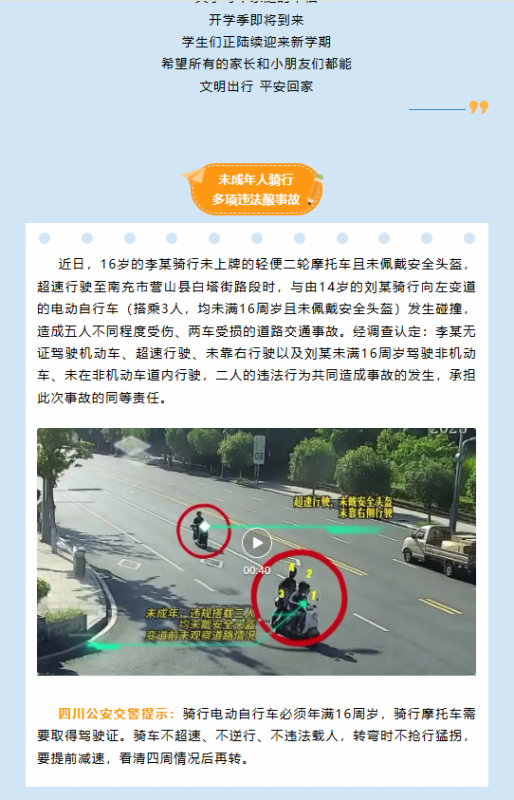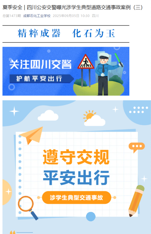 学校将交通安全教育融入日常教学场景,依托每周升旗仪式、主题班会课等重要载体,结合鲜活的交通事故案例深入讲解,向学生系统普及“一盔一带”安全守护知识、红绿灯与斑马线规范通行规则、道路潜在危险规避技巧及交通事故应急处置方法。同时重点强调“不闯红灯、不横穿马路、不骑行违规车辆、不改装车辆、不超速行驶”等核心要求,让交通安全意识渗透到学生学习生活的每一个环节。在线上宣传层面,学校官方微信公众号同步推送《夏季安全|四川公安交警曝光涉学生典型道路交通事故案例》专题推文,辅以事故现场视频及实用安全小贴士,方便学生与家长随时查阅、反复学习,有效打破时空限制,实现了安全教育“时时可学、处处可看”,进一步扩大了教育覆盖面与影响力。