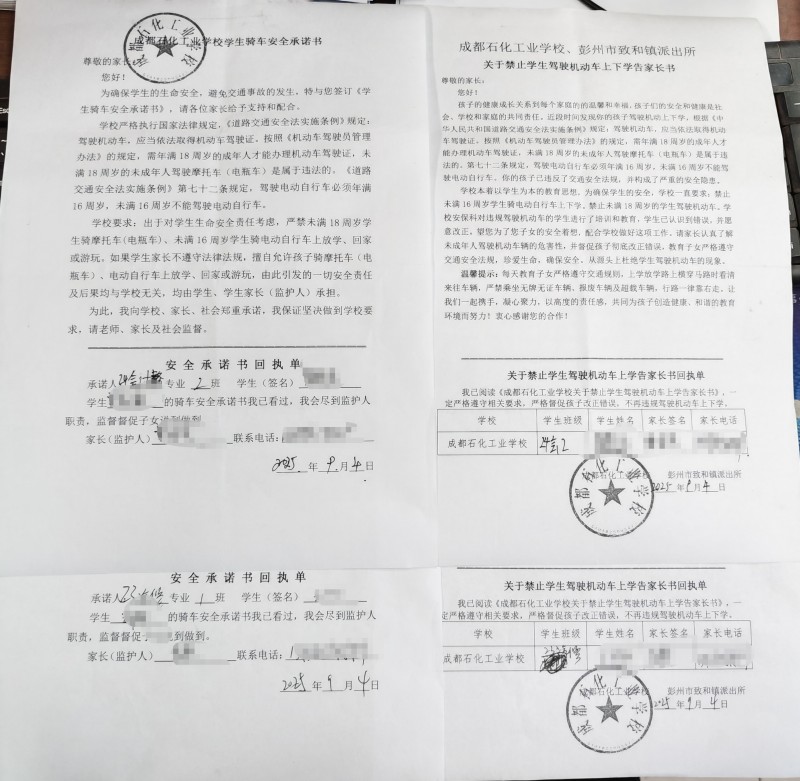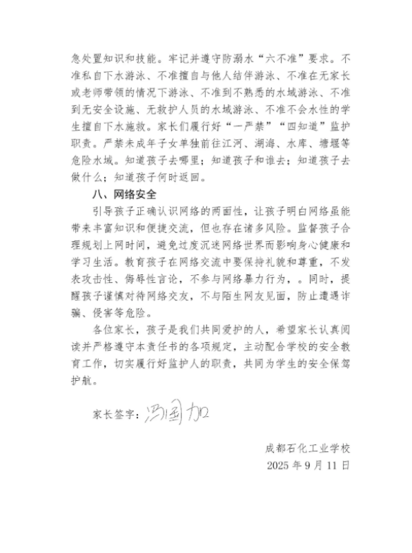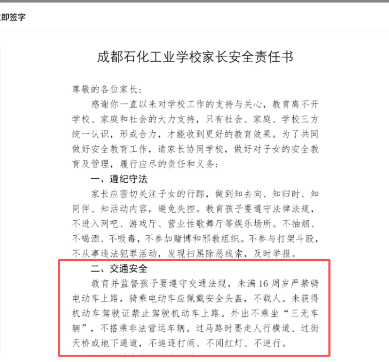 为压实交通安全责任,学校向全体家长发放《成都石化工业学校家长安全责任书》,明确告知机动车法定驾驶年龄、违规驾驶的安全风险及相关法律法规要求,呼吁家长切实履行监护职责,做好孩子日常出行的安全引导与行为规范。 针对骑行上下学的学生群体,学校进一步细化管理措施,组织学生及家长共同签订《学生骑车安全承诺书》,从“规范佩戴安全头盔、不逆向行驶、不违规载人”等具体行为入手,明确各方责任边界。通过这一系列举措,学校成功构建起“学校监督、家长负责、学生自律”的交通安全三方联动管理机制,形成家校携手守护学生出行安全的强大合力。