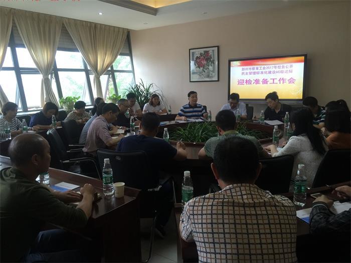 ? ?5月24日上午十点,彭州市教育工会2017年校务公开民主管理标准化建设A、C级达标迎检准备工作会在成都石化工业学校南校区召开。彭州市总工会、彭州市教育工会、彭州市各区片工会负责人以及全市学校的工会主席参加了这次会议。