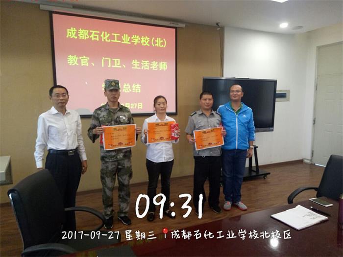 会上生活老师易正焕、教官蒲国双、门卫李运均受到了学校和公德物业公司的表彰,被评为“本月优秀员工”领取了荣誉证书和奖品。