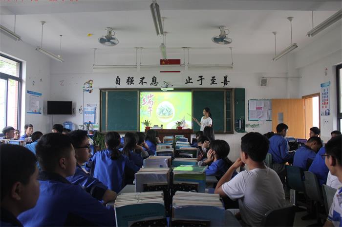 班会上师生一起追溯了端午节的由来,讲述了屈原的故事,让学生明白端午节不只是粽子节、龙舟节,更是民族节、爱国节。老师们还向学生介绍了有关端午的“端阳”、“重五节”、“诗人节”、“龙日”等不同内涵的名称,涉及端午悬挂艾草、佩香囊、赛龙舟、吃咸蛋、吃粽子等各地不尽相同的民风习俗。