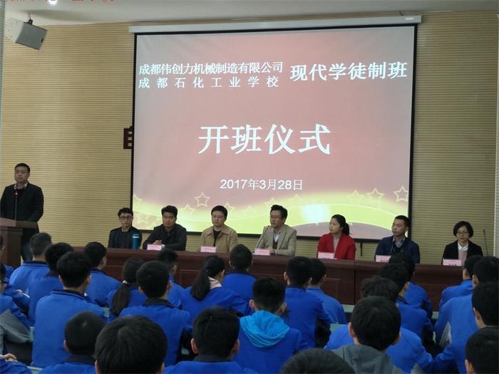 成都伟创力机械制造有限公司王总在发言中表示,公司一定会全力配合学校,在实训师傅、技术指导、企业文化等方面支持学校,一定做好校企联合育人,建立双元育人机制。周川益副校长代表学校感谢伟创力机械制造有限公司领导对学校工作的支持,向学员介绍了现代学徒制教学模式的特点,希望学员珍惜学习机会,刻苦钻研专业技能,保证圆满完成学习任务。并对学员纪律、学员技能、学员考核等方面提出严格的要求。学生代表发言表达了学员学习的决心,不忘自己的承诺,坚定信心,克服一切困难,争取通过企业化的锻炼,使自己成为一名合格的高素质的企业员工。