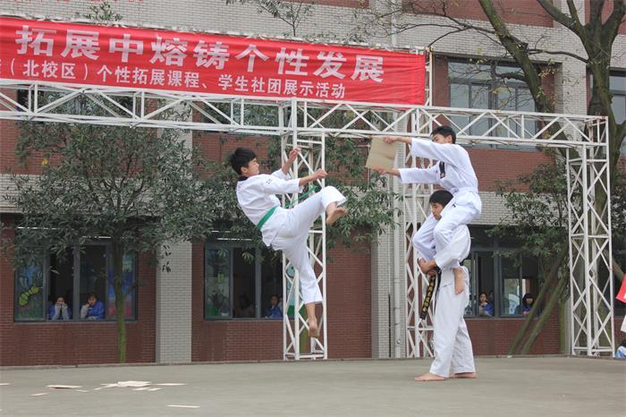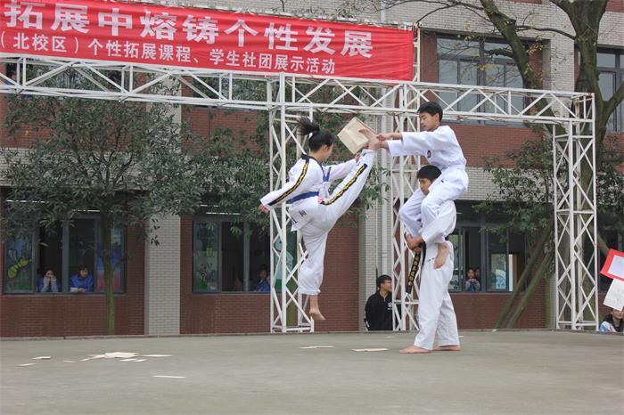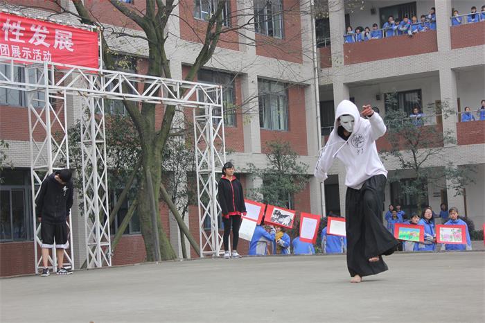 上周四中午,成都石化工业学校北校区运动场上,动漫美术社、鬼步社、舞蹈社、吉他社、跆拳道社等14个社团展示了才艺水平,美术社、手工制作、电脑组装与维修等8门个性拓展课程展示了训练成果。现场气氛热烈,围观学生掌声不断。